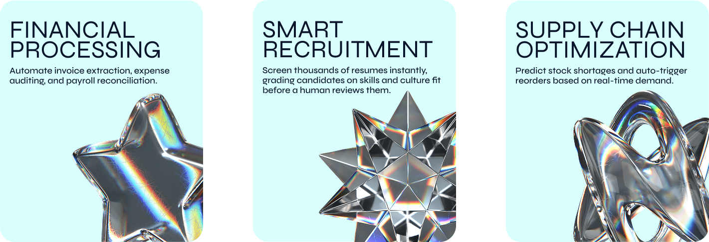 We help you automate more than just simple tasks. Our AI systems understand unstructured data (like documents and emails), make decisions in real-time, and execute complex workflows automatically. This lets your team focus on strategy while the day-to-day operations run in the background.